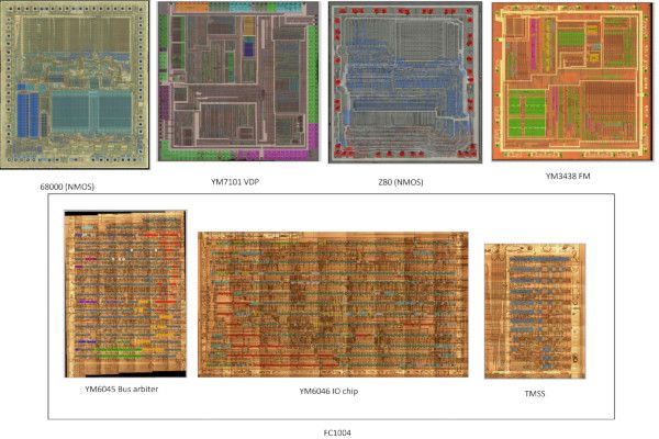 "The Sega Mega Drive chipset consist of 6 integrated circuits + RAM chips." nukeykt explains. "Motorola 68000 (Main CPU); Zilog Z80 (Sound CPU); Yamaha YM7101 (VDP); Yamaha YM2612/YM3438 (FM); Yamaha YM6045 (Arbiter); Yamaha YM6046 (IO); TMSS (later revisions)."