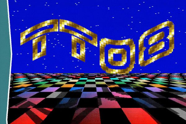 "The intro features a background starfield, a panning 3D chequerboard with colourful tiles, and wavy scrolling text which casts a shadow onto the chequerboard. I was inspired by lft’s first AVR demo Craft to add a little cyan oscilloscope to the side of the screen as well. This design ended up using 3,374 total cells and filling just about every square nanometre.