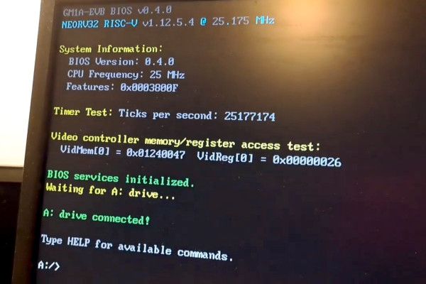 The project, which is partially created using the output of a large language model (LLM), currently has a working video controller offering 80x30 text mode with a 2,048-glyph USC-2 character encoding, 16-bit attributes with 12-bit RGB foreground and background colours, a PS/2 keyboard interface, and what Yuri says “is believed to be the first working QSPI PSRAM controller for the Olimex GateMateA1-EVB board.” The CPU, meanwhile, is a NEORV32 implemented the RV32IM subset of the RISC-V instruction set and running at 25.175MHz.